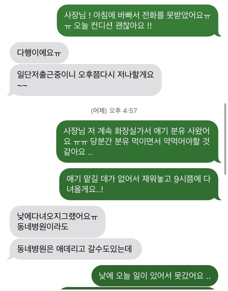 다음 날 더이상 배가 아프지않아 괜찮은 것 같다고 문자를 드렸고 오후 12시쯤 밥을 먹었습니다 밥 먹고 세시쯤부터 다시 배가 아프기 시작하더니 또 계속 설사를 해서 한동안 애기는 분유 먹이고 저는 지사제 먹으려고 사장님께 연락을 드렸고 사장님께서는 병원에 가라고 하셨지만 제가 애기를 맡길데가 없어서 병원에 가지 못하는 상황이었습니다 9시쯤에 애기 맡기고 응급실을 가겠다고 하나보험처리를 하려면 육회비빔밥을 먹고 탈이 났다라는 증명서를 받아와야해서 불가능하다고 하시며 법적으로 자기가 책임져야할 의무가 없는데 도의적인 책임으로 병원비를 내주려고 한다 하지만 응급실은 부담이 된다 라고 말씀하셔서 저도 배달을 시켜먹지않았으면 평소와 같은 생활을 했을 것이다 라고 말씀드렸고 사장님께서 어떻게 해주길 원하냐고 하셔서 제가 나을 때까지 병원비를 내주셨으면 한다고 해서 알겠다고하고 통화가 끝났습니다.