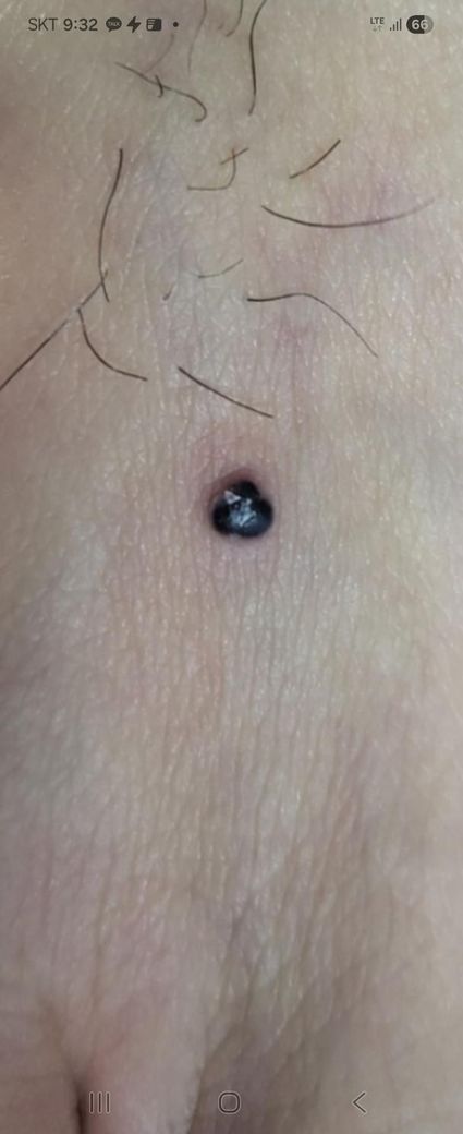 첫째, 혈관성 병변(체리혈관종 또는 혈전성 혈관종)입니다. 혈관이 확장되거나 내부에 혈전이 생기면 검거나 짙은 색으로 보일 수 있고, 갑자기 생긴 것처럼 느껴질 수 있습니다. 통증 없고 크기 변화가 없는 점은 이쪽과 맞습니다.