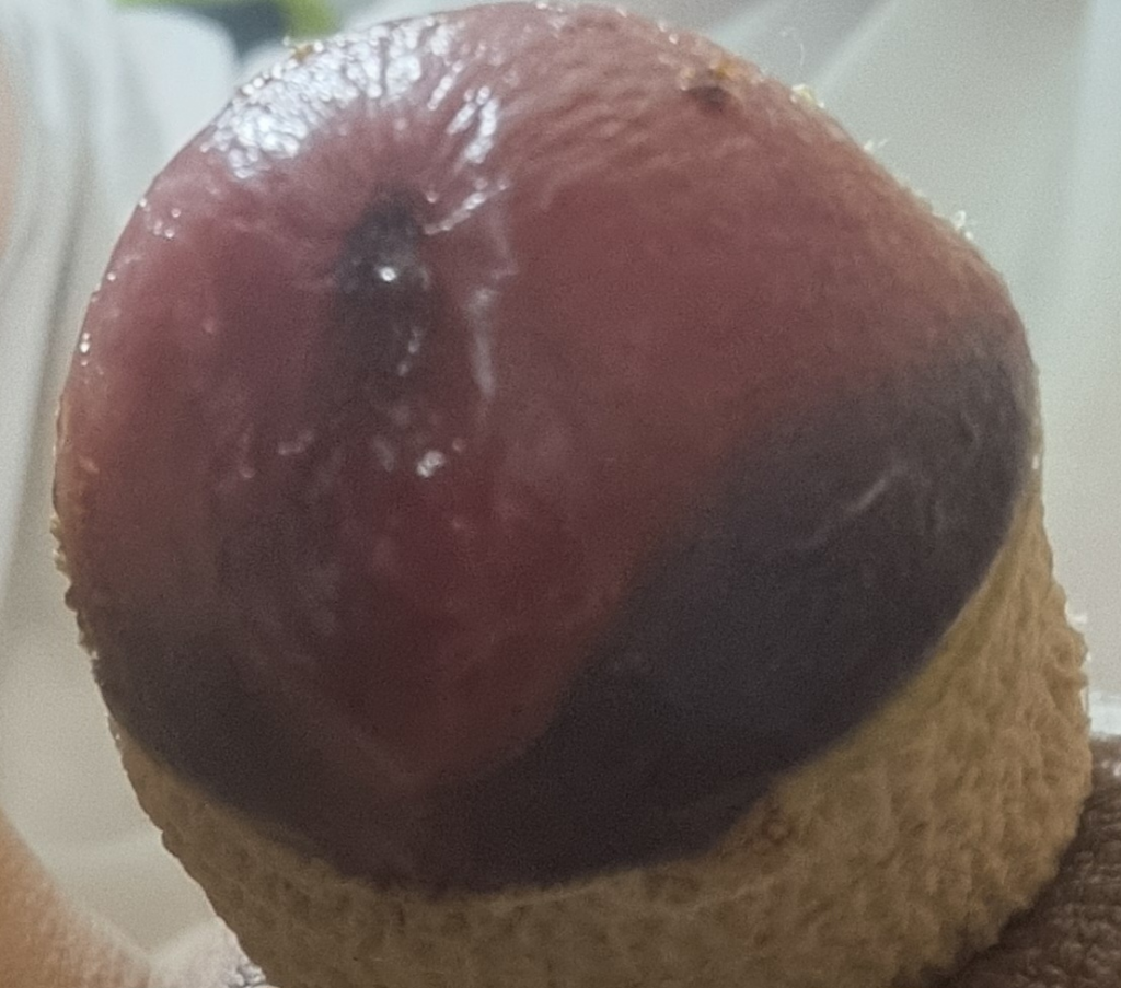 지금은 귀두가 조금 쭈글쭈글하고 딱지도 있고요, 요도 아래 귀두부분에 검게 멍이들어있고 요도입구가 부어있습니다.