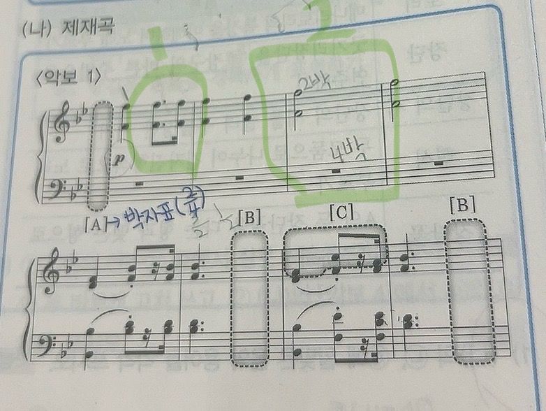 초록색2번은 아마 잘못표기된거같네요 2/4박자면 쉼표가 아래를 향하는게아니아 위를향해야 2분쉼표니까요