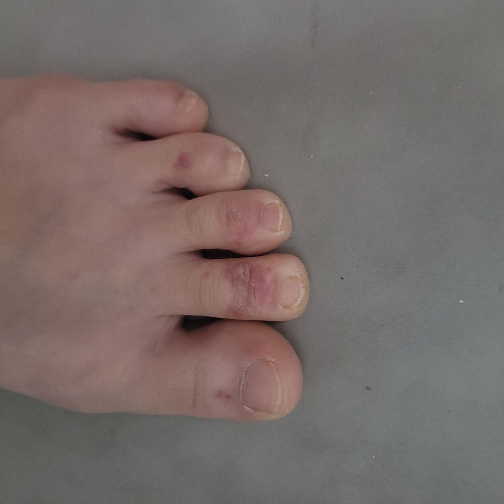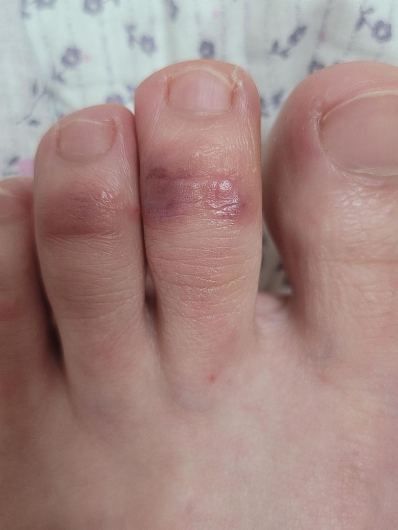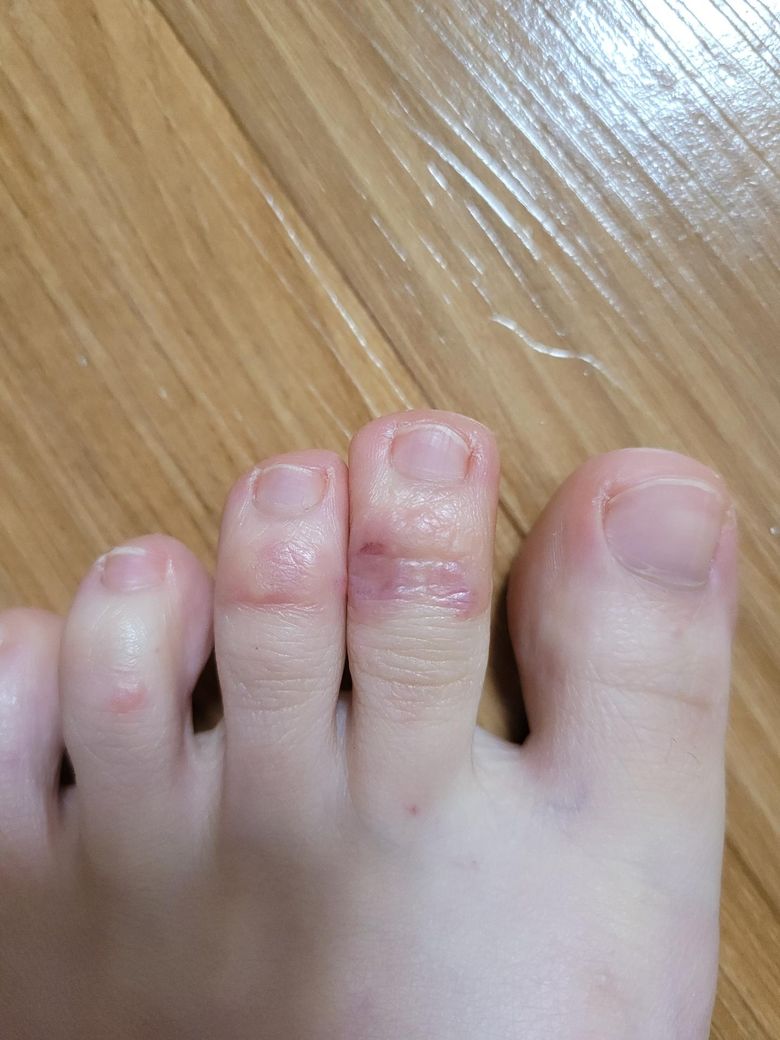 사진상으로는 발가락 등쪽 관절 부위에 국한된 홍반, 경미한 부종, 얇은 수포 흔적이 보이며, 고름이나 진행성 감염 소견은 뚜렷하지 않습니다. 임상적으로는 굳은살 제거로 인한 미세 상처 이후, 신발 마찰과 밀폐·보온 환경이 겹치면서 발생한 마찰성 수포 또는 자극성 접촉피부염 양상이 가장 타당해 보입니다. 꾸덕한 크림을 반복적으로 바르고 양말 착용, 전기장판 사용으로 국소 습기와 열이 유지되면 각질층이 불어나 피부 장벽이 더 약해지고, 작은 자극에도 수포가 생기기 쉽습니다. 수족냉증은 직접 원인이라기보다는 회복 지연 요인으로 작용했을 가능성이 있습니다.