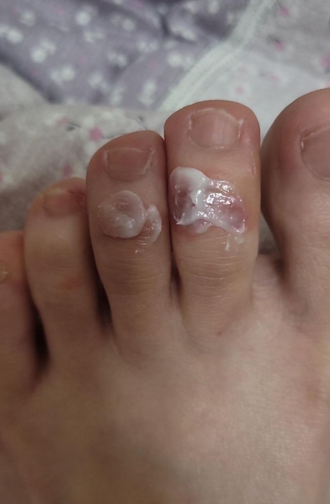 1번사진 검지발가락위 굳은살을 발톱깎으며 좀 잘랏는데 알바하며 등 신발 걸을때 마찰이 되어 붉어지고 그래서 보 꾸덕한 크림을 올려놓고 양말신고 수족냉증으로 전기장판 틀어주고 신경썻는데 물집이 올라왓어요.