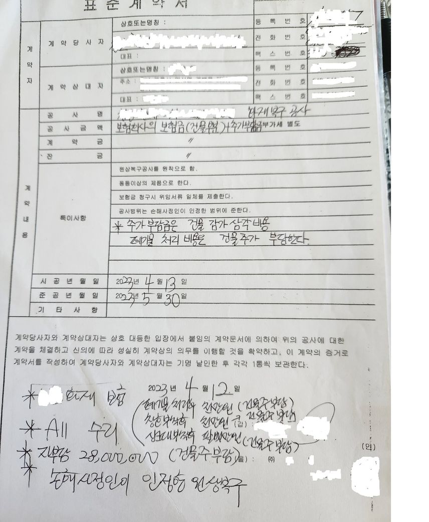 화재인테리어 계약서에 상호명을 변경전 것으로 기재함. 계약서가 유효한가요? 법인등기에 상호명과 다름. 공사전 자부담 2800만원 문구를 계약서에 쓰고 입금함. 보험회사직원은 저희처럼 먼저 돈을 준 세대주는 없었다고 함. 계약서상 공사금액을 보험금(건물부분)+추가부담금이라고 쓰여 있음. 업체는 저희에게 2800만원과 보험금 전체 5760만원 요구함. 보험금은 우리가 수령예정임. 공사금액을 보험금(건물부분)+추가부담금 이 문구는 모호함. 저희는 보험금을 2800만원 제하고 주겠다 입장을 전달함. 정확한 금액 미기재된 계약서대로 우리가 다 지급해야 하나요? 부모님 나이드셔서 계약서가 말도 안된 내용으로 되어 있어요.