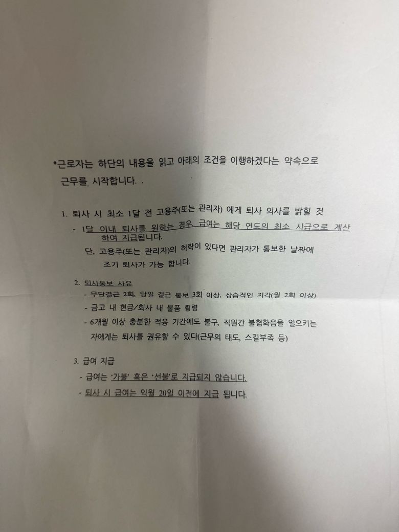 근로계약서 별지에 "1달 이내 퇴사를 원하는 경우, 급여는 해당 연도의 최저 시급으로 계산하여 지급됩니다"라는 조항이 있습니다.