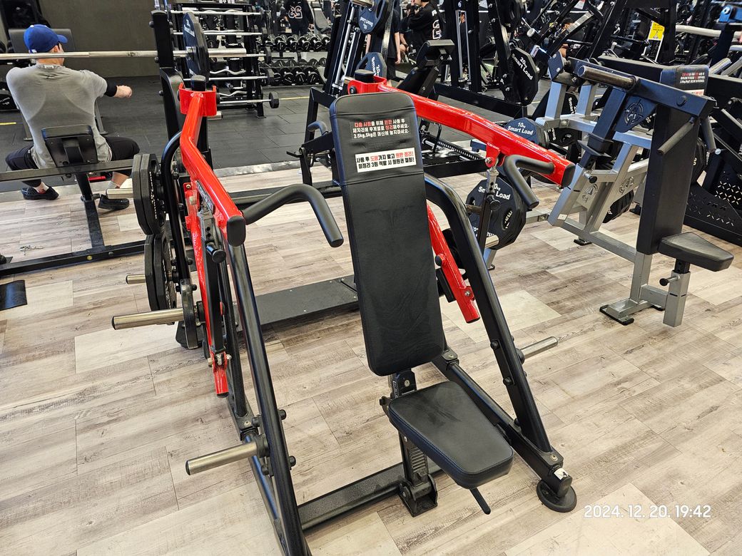이 헬스 기구는 체스트 프레스(Chest Press) 머신으로 보입니다. 이 기구는 주로 가슴 근육(대흉근)을 강화하는 데 사용되며, 보조적으로 삼두근(팔 뒤쪽)과 어깨 앞쪽(전면 삼각근)도 사용됩니다.