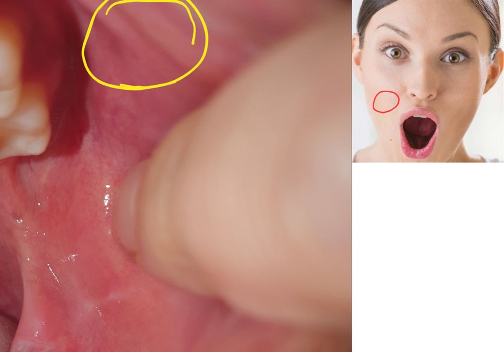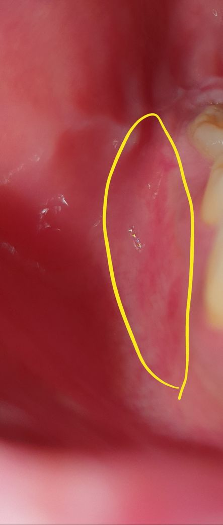 동그란 무언가 있는 편 구강내에서 엄지로 노란부분을 누르면 아픕니다...ㅠㅠㅠㅠ