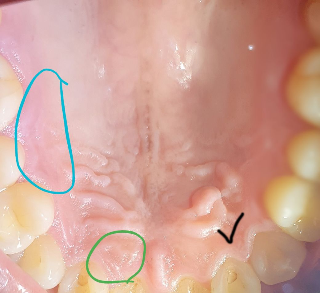 파노라마 사진 상에서는 특별히 큰 문제점은 발견되지 않고 초록 동그라미 친 부분도 palatal rugae 라는 정상구조입니다.
