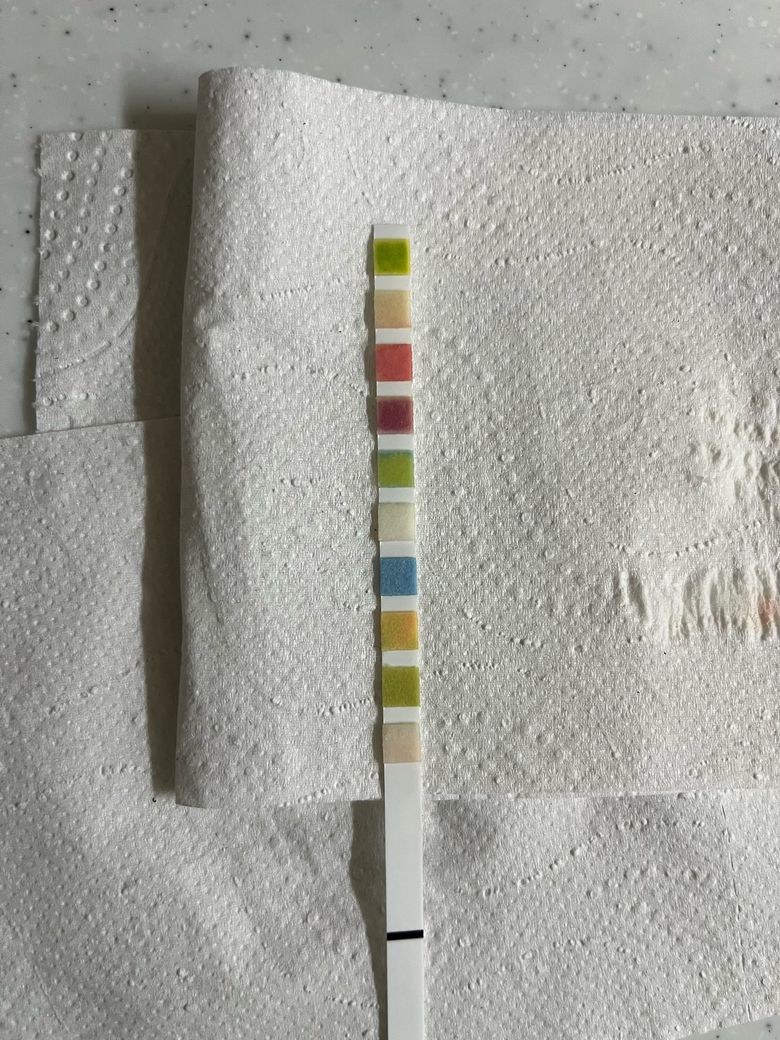 사진상으로 색이 명확하지 않을수 있으니 직접 소변스틱 포장지에 있는 색상표와 각 칸을 1:1로 비교해 보세요.