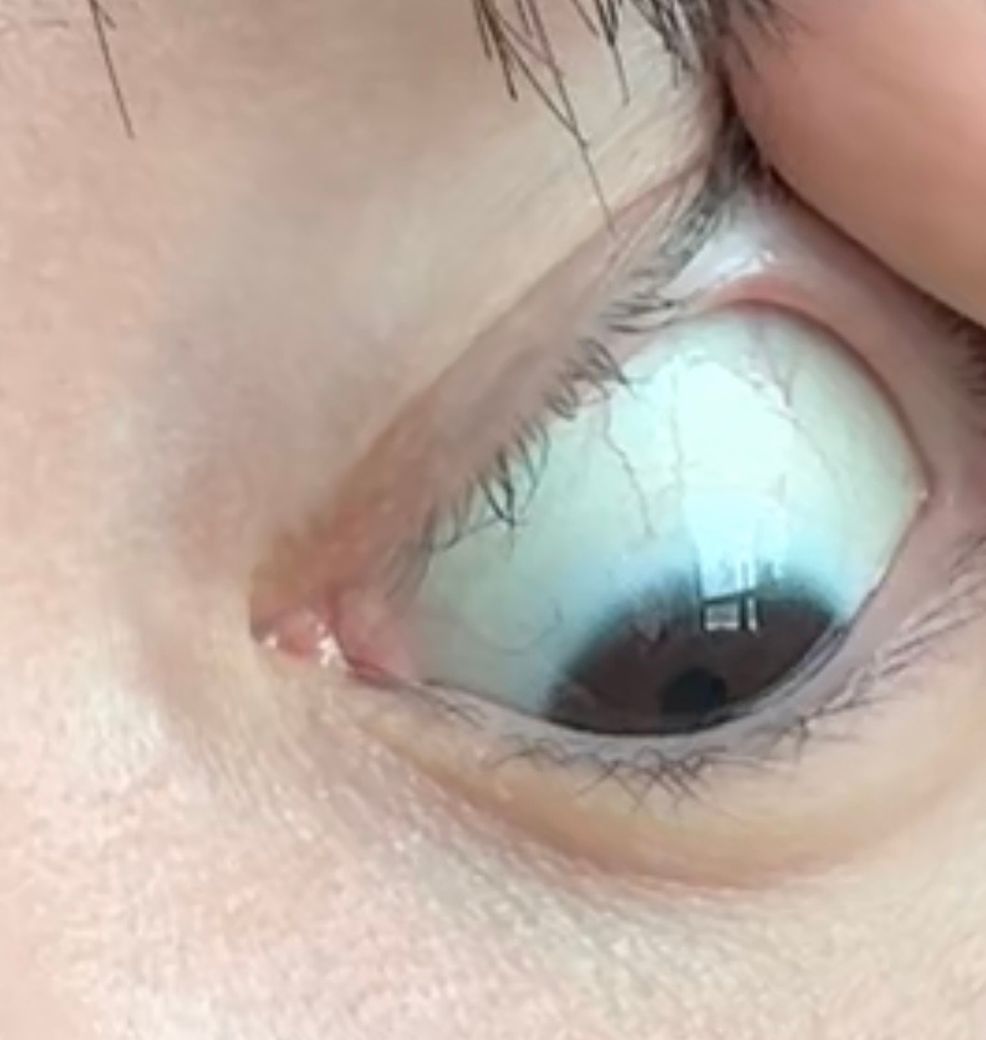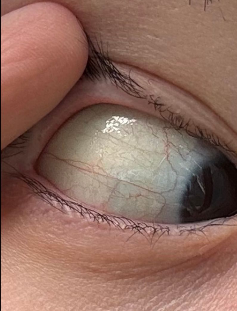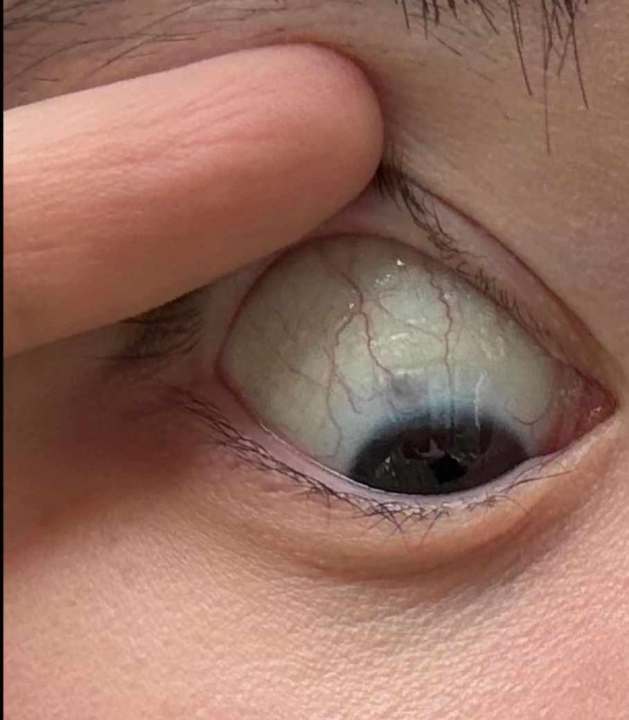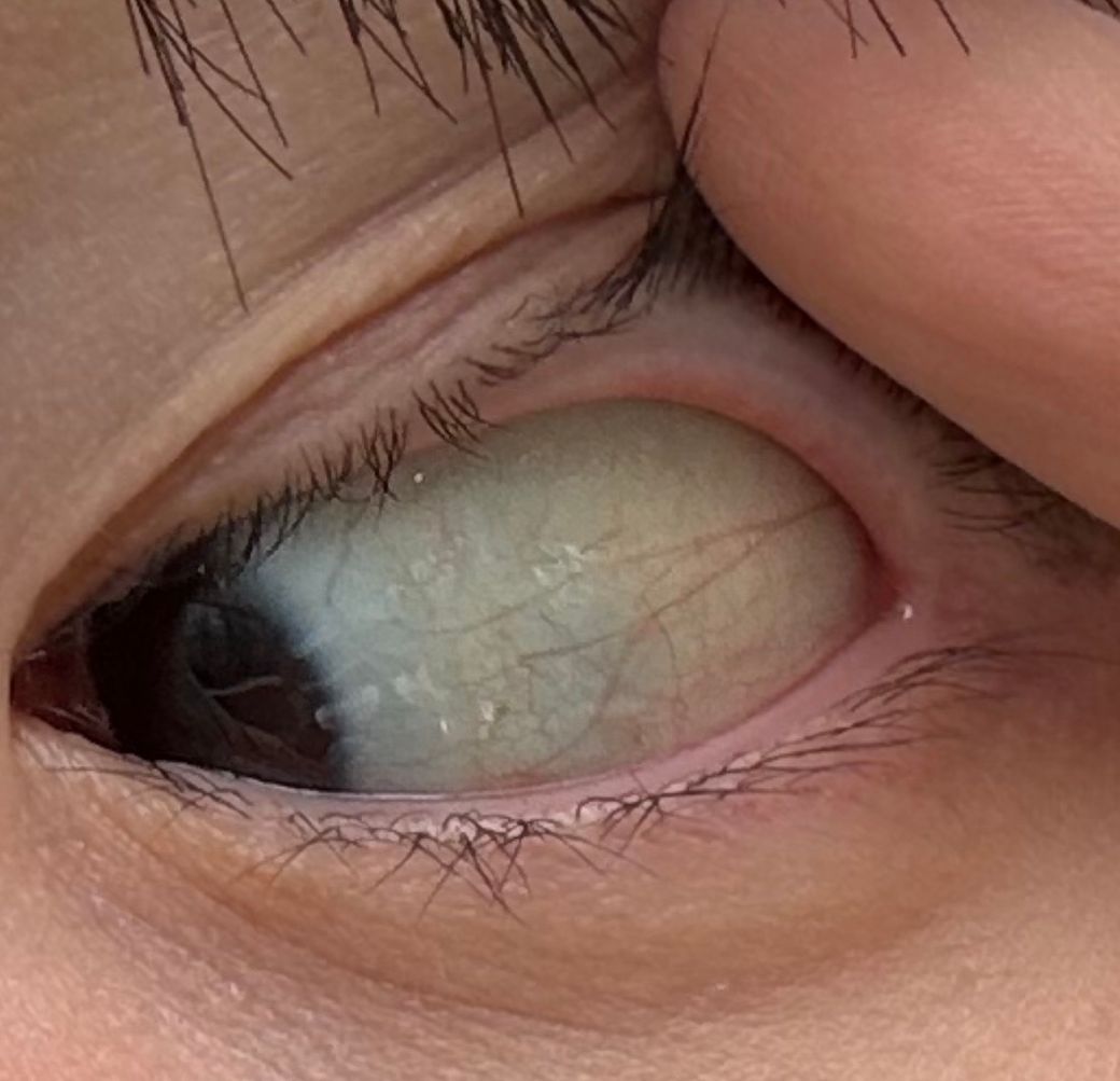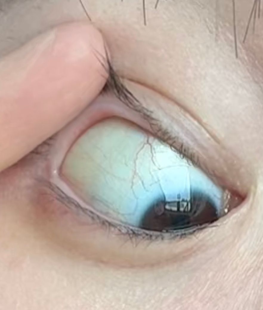 사진상 공막(흰자)이 전반적으로 균일한 황색으로 뚜렷하게 변한 소견은 보이지 않습니다. 약간 누렇게 보이는 부분은 조명 반사, 결막 혈관, 결막 지방 침착(pinguecula) 또는 건조로 인한 색 변화로 설명되는 범위로 보입니다. 전형적인 황달은 공막 전체가 레몬색 또는 진한 황색으로 비교적 균일하게 착색되는 양상을 보입니다.
