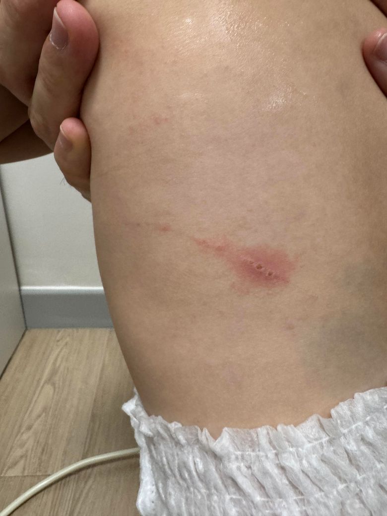 14개월 아기 등 쪽에 어디서 긇혔는지 이렇게 상처가 나있습니다. 사진상으로는 약간 부푼듯이 보이는데 실제로는 크게 부풀어 있지는 않습니다.딱지가 진 듯한 모습입니다.