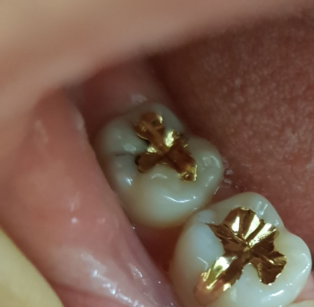 뒤쪽 치아의 골드 인레이가 많이 썩어 보입니다. 인레이와 치아에 틈이 생겨서 안쪽으로 충치가 다시 생긴거 같으니 치과에 가셔서 검진을 받아보세요.