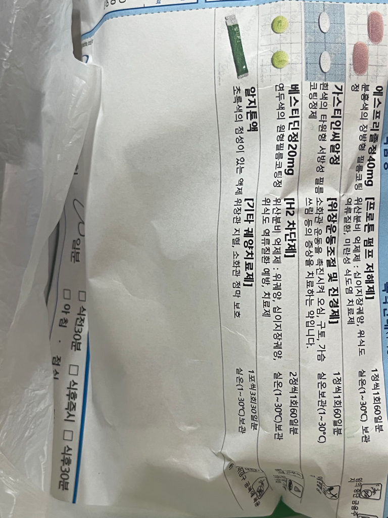 그런데 6월중순부터(처방받은 약 다먹은 후) 목을 조르는 듯한 답답함이 심해지고 위가 아팠습니다. 결국 병원을 옮겨 새로운 병원에서 사진 속 역류성 식도염 약을 타와 복용했습니다