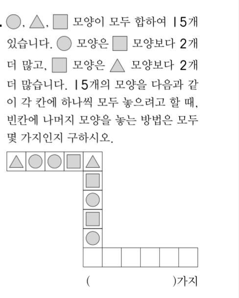 총 15개이고, ○=□+2, □=△+2인 상황에서 ○=7, □=5, △=3 이면 갯수가 맞습니다. 그리고 그림에서처럼 ○가 4개 그려져 있고, □는 3개, △는 2개가 나온 상황에서, 남은 ○는 3개, □는 2개, △는 1개가 남아있습니다. 경우의수를 구해야 하는데,