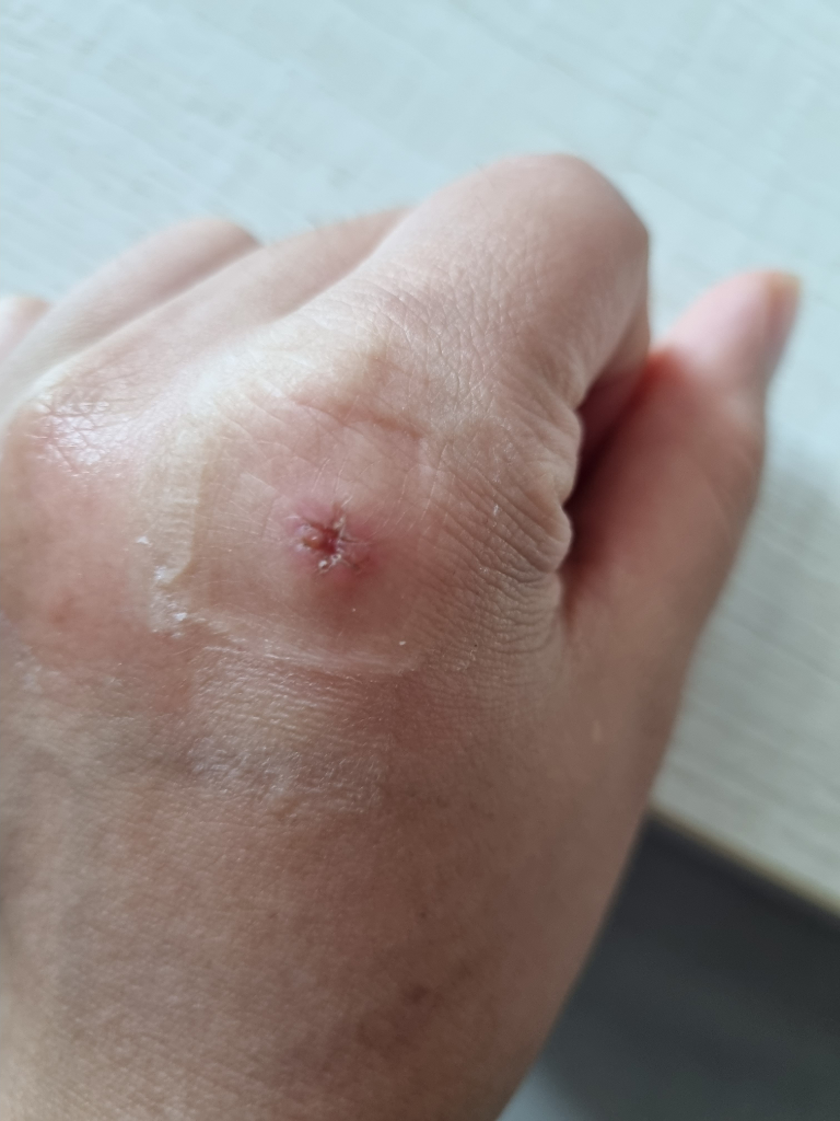 꼬맨상처가 봉합된 일자가 아니라 동그랗게 파여져 있어요.
