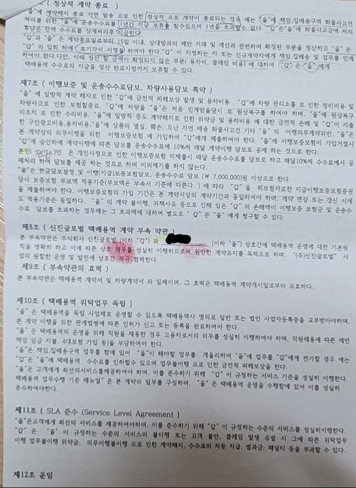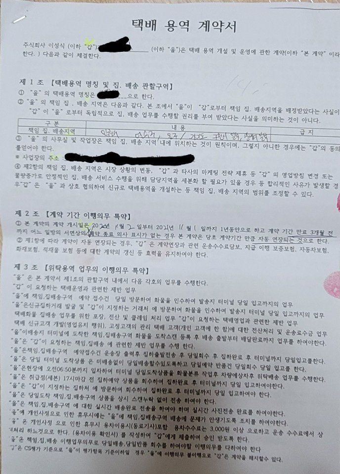 6 제 10조에 을은 택배용역 독립 사업체로 운영할 수 있도록 택배용역사 명의로 일반 또는 법인 사업자등록증을 교부받아야 하며, 계약 이행을 위한 관계법령에 따른 인허가 신고 또는 등록을 완료하여야 한다라고 명시 되어있는데,