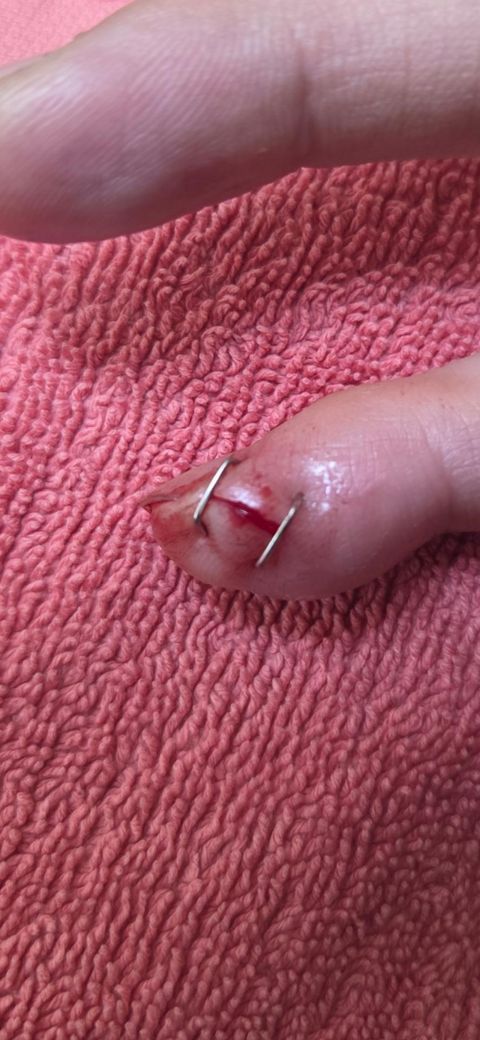 사진상 금속 피부 스테이플(skin staple)로 2개 봉합한 상태로 보입니다. 손가락 끝 부위의 비교적 직선형 열상으로 판단됩니다.