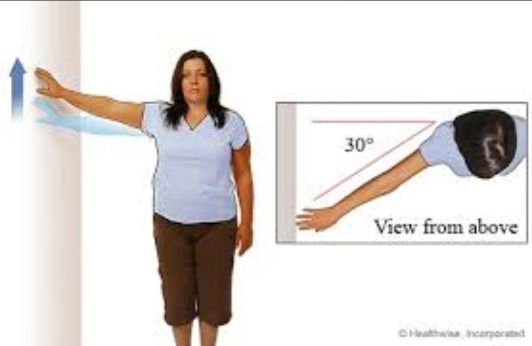 벽을 향해 서서 손가락으로 벽을 조금씩 짚어 올립니다. 통증이 심해지기 전까지만 올리고 5초 유지 후 내립니다. 10회 반복합니다.