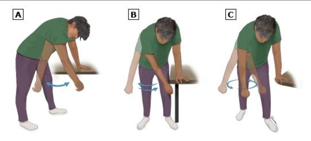 상체를 약간 숙이고 아픈 팔을 힘 빼고 아래로 늘어뜨린 뒤, 작은 원을 그리듯 앞뒤·좌우로 흔듭니다. 하루 1회에서 2회, 각 방향 20회 정도. 통증 범위 내에서 시행합니다.