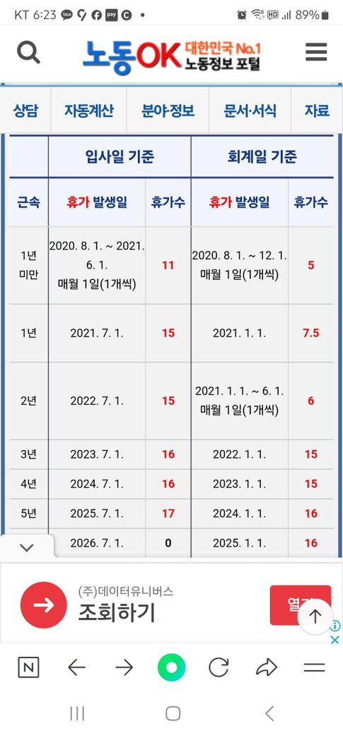 2년마다 연차 한개가발생을한다는 기준인데, 위의 계산법이 맞는건가요?