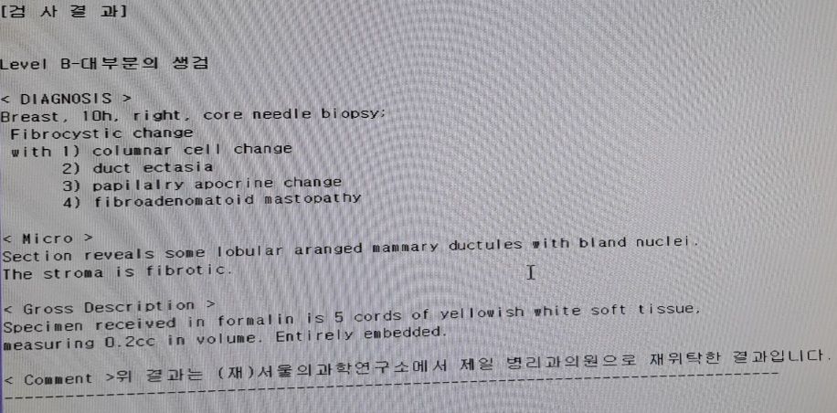 진단에는 '섬유낭성 변화'와 이와 관련된 몇 가지 구체적인 변화들이 언급되어 있습니다: 기둥상 세포 변화, 유관 확장증, 유두상 아포크린 변화, 섬유선종상 유방염. 이러한 변화는 대개 암이 아닌 조건을 의미하며, 흔히 유방에서 발견되는 비암성 질환에 해당됩니다. 'Micro' 섹션에서는 유방 조직의 일부가 무해한 핵을 포함한 정상적으로 배열된 소엽유관으로 구성되어 있으며, 주변 조직은 섬유화되어 있다고 설명합니다. 이 결과만으로는 암을 나타내지 않습니다.