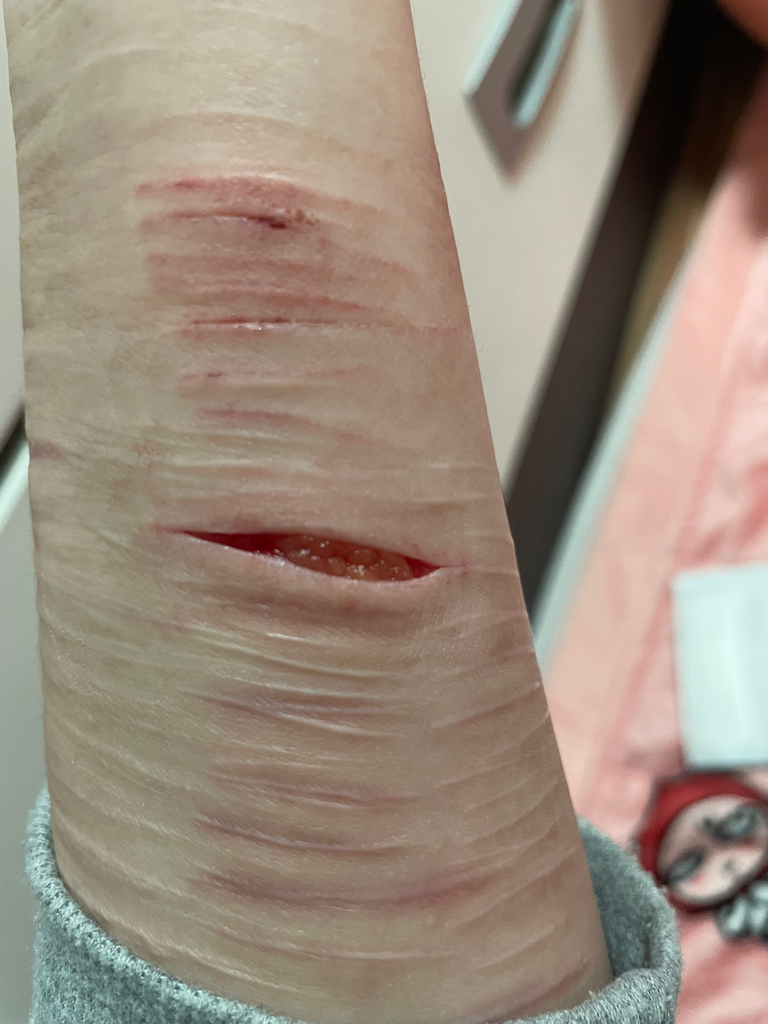 봉합이 필요한 상처입니다. 반드시 병원을 방문하셔야 합니다. 방치하시면 감염증 발생의 우려가 존재합니다. 이와 별개로, 정신건강의학과 진료를 추가로 받아보시기 바랍니다.