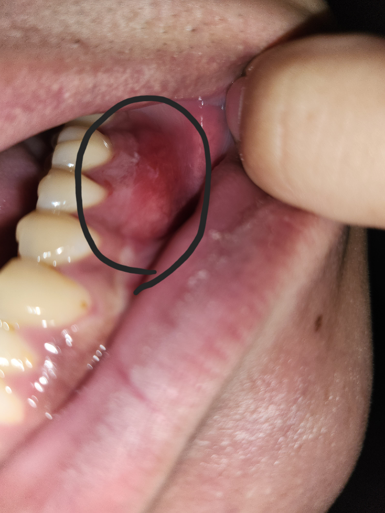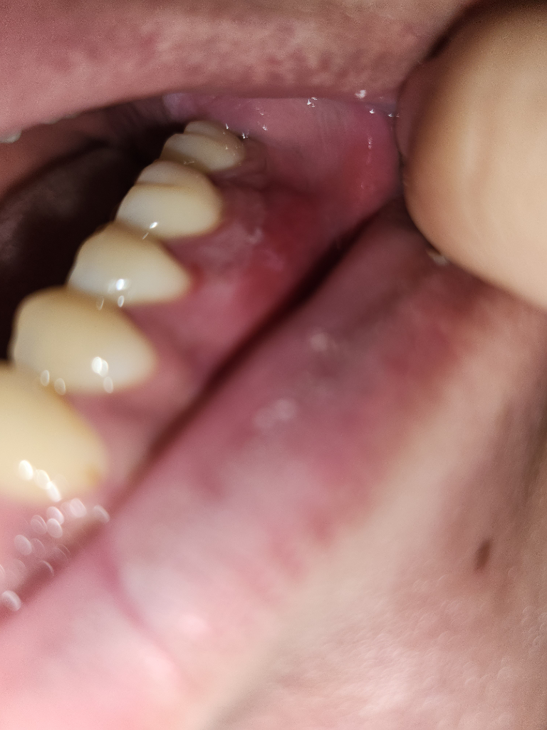 구강 내 연조직 질환일 수도 있으며, 잇몸에 대한 염증으로 인하여 나타날 수도 있습니다. 다만 사진으로는 정확한 판단이 어렵습니다. 해당 증상이 2주 이상 지속되거나 통증 및 불편감이 크다면 치과 방문 후 검사를 해보시는 것을 권해드립니다.
