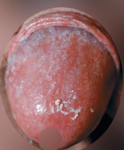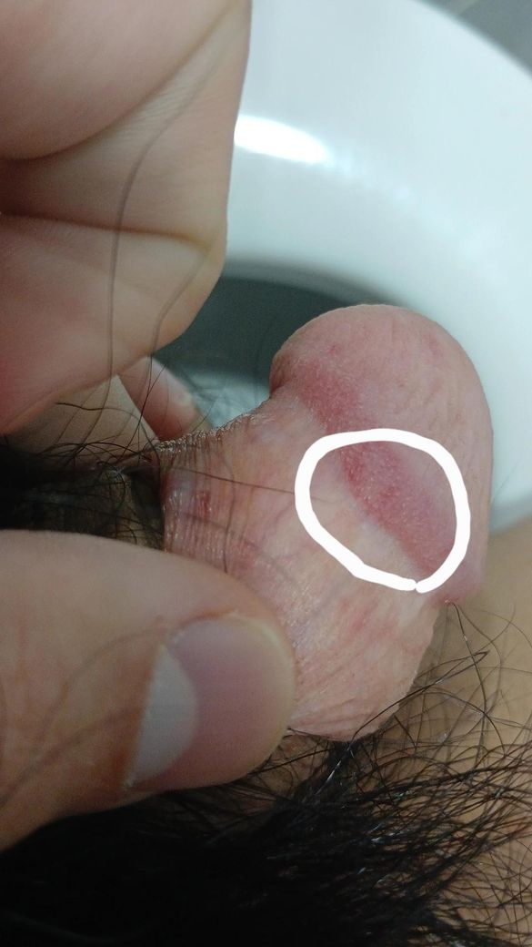 우선 귀두 전반에 균일한 발적이 있고, 표면에 하얀 찌꺼기처럼 보이는 부착물이 관찰됩니다. 작은 구진이 산재해 있으나, 수포나 궤양 형태는 보이지 않습니다. 위 사진이 전형적인 칸디다 포피염 입니다.