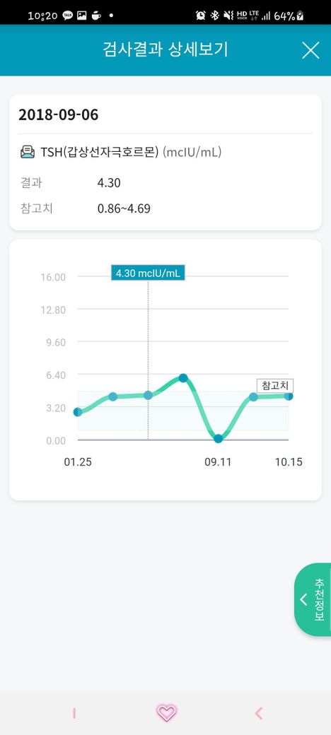 네 갑상선 자극 호르몬 수치가 09.11에 확 떨어졌다는것은