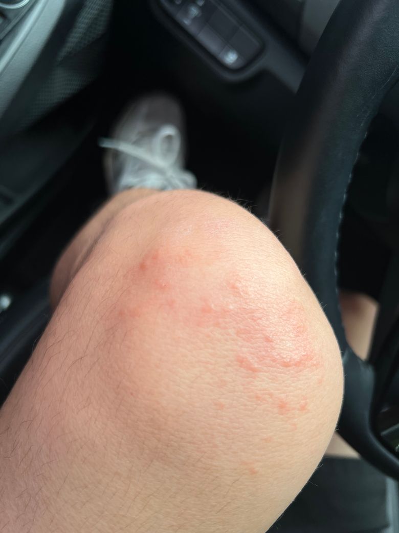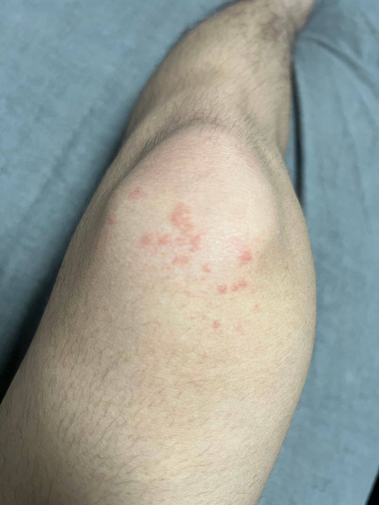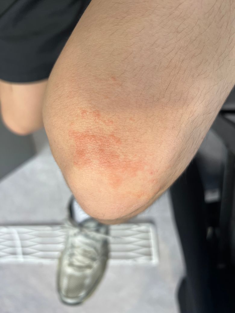 3일전 사진과 현재 순서대로 사진 올립니다 갑자기 습진 같은게 나더니 지금은 이만큼 번졌습니다 해당 부위인 무릎에 대해 통증은 별로 없었고 어깨나 목쫃으로 근육통이 이어졌습니다
