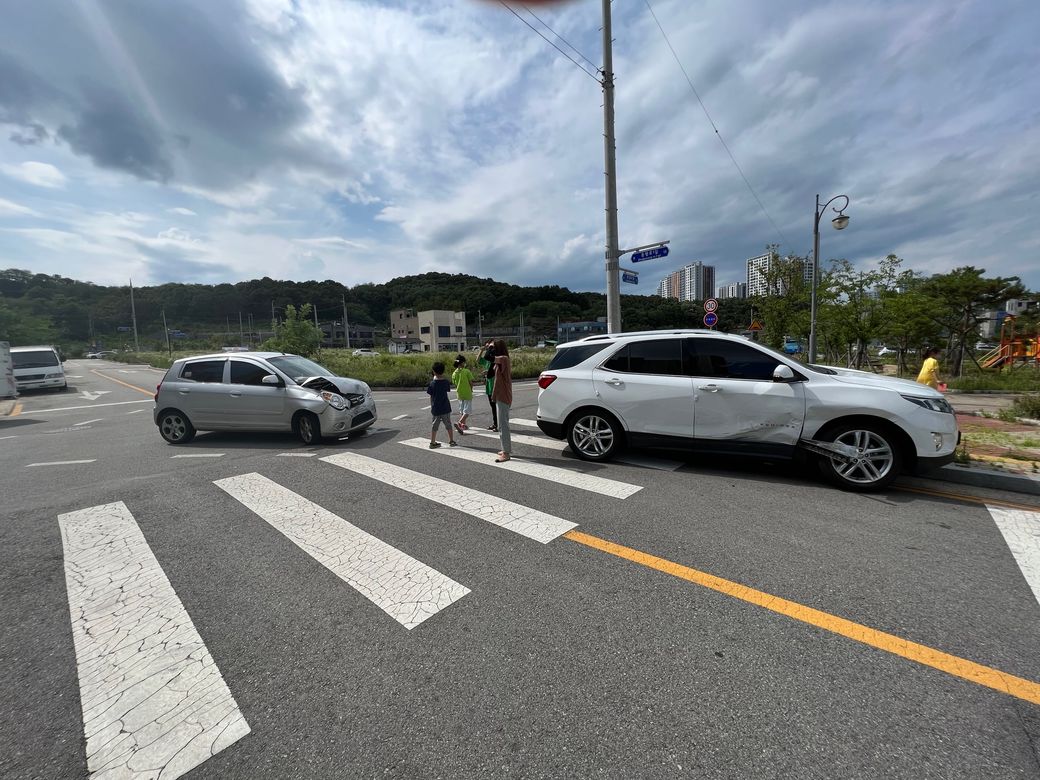 폭이 똑같은 신호가 없는 교차로에서 사고가 발생했습니다.