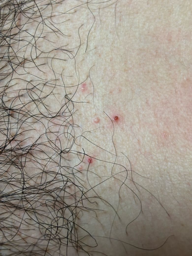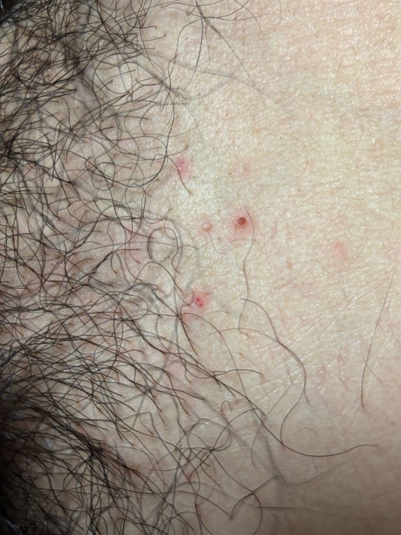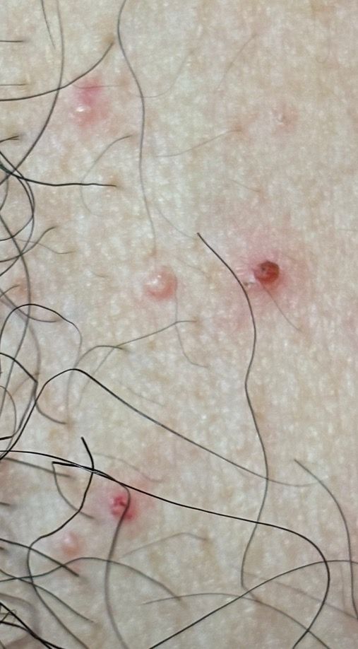 사진상 병변은 음모가 있는 부위의 모낭을 중심으로 한 1–3 mm 정도의 홍색 구진 형태이며, 일부는 중심에 점 모양의 출혈 또는 가피가 보입니다. 전형적인 생식기 단순포진 2형(Herpes simplex virus type 2)의 경우, 홍반성 기저 위에 여러 개의 군집성 수포가 생기고, 통증이나 작열감이 동반되는 경우가 대부분입니다. 이후 수포가 터지면서 얕은 미란이나 궤양으로 진행하는 양상이 흔합니다.
