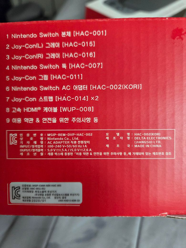 HAC-002(KOR)은 닌텐도 스위치에 포함된 충전기 모델명이에요. 본체는 HAC-001 모델명을 가지고 있어서 배터리 개선판을 구매한게 맞습니다!! ㅎㅎ