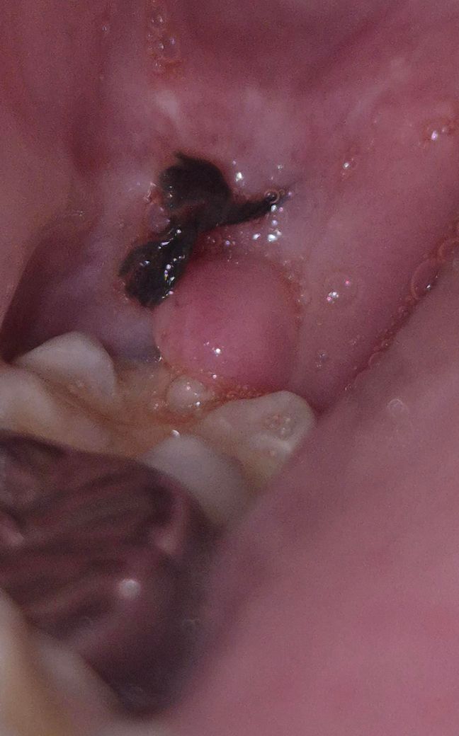 실밥으로 봉합을 해서 잇몸이 올라 온상태입니다. 큰 문제가 잇는건 아니니 너무 걱정은 안하셔도 될것같습니다.