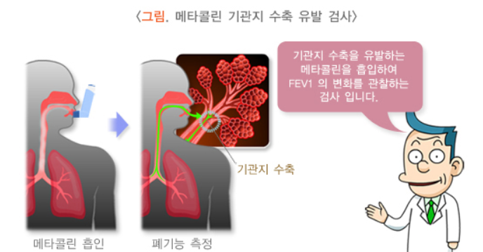 기관지 유발검사는 기관지 수축을 유발하는 메타콜린과 같은 약물을 사용하여 (흡입)