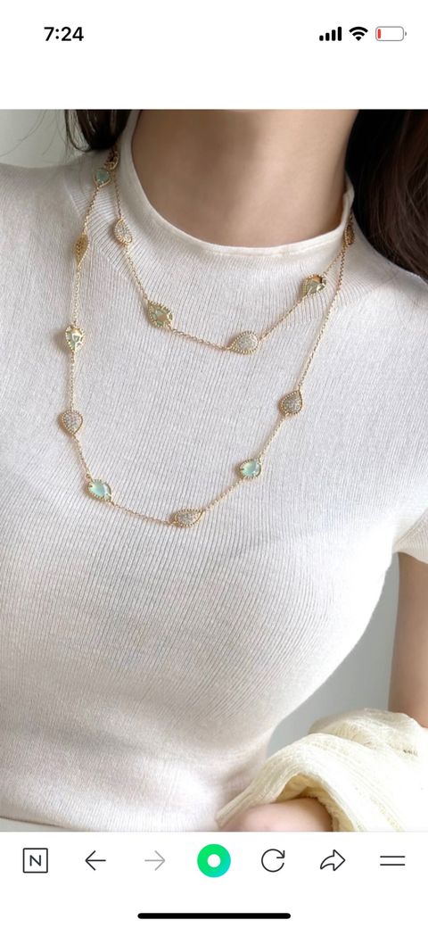 사진 속 목걸이는 브랜드나 제품명이 명확하게 드러나지 않아서 정확한 정보는 확인이 어렵습니다. 다만 디자인을 보면 반클리프 아펠의 알함브라 라인이나 불가리의 디바스드림처럼 자개나 컬러 스톤을 활용한 고급스러운 스타일과 유사해 보여요. 특히 레이어드된 형태와 섬세한 팬던트가 반클리프 스타일과 닮았다는 의견이 많습니다. 확실한 브랜드 확인을 원하신다면 주얼리 편집숍이나 백화점에서 비슷한 디자인을 보여주며 문의해보는 것도 방법이에요.