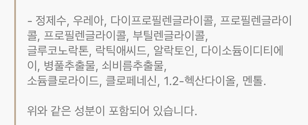 프로필렌글라이콜: 피부에 자극을 줄 수 있으며, 과다 사용 시 알레르기 반응을 일으킬 수 있습니다.