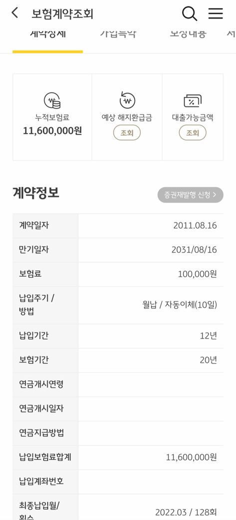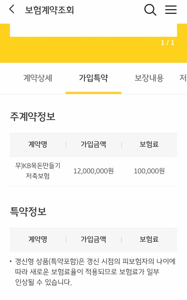 그리고 증권을 받아보시면 12년납입 20년 만기시 금액이 있습니다.