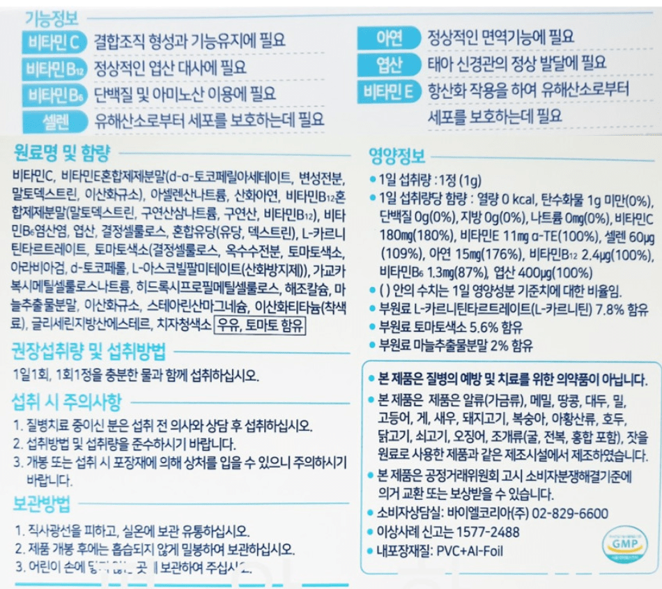 * 아래 영양제 성분표 참고하여 답변부탁드립니다~