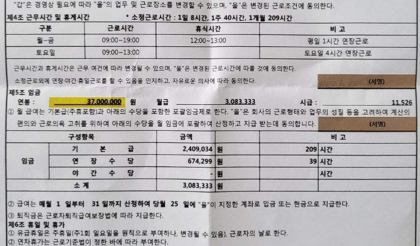 연봉이라라고해놓고 연장수당을이래저래 40시간 끼워넣고. 3700에 맞추는것도 이해가 가질 않습니다..통상적으로 이게 무슨 논리인지 모르겠습니다.