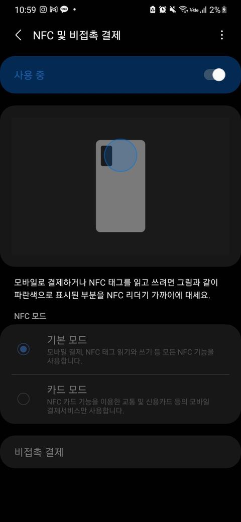 이미 올려주신 화면처럼 기본 모드가 활성화 되어 있더라도 상단 빠른 설정창의 NFC 아이콘을 한 번 끄고 다시 켜보세요.