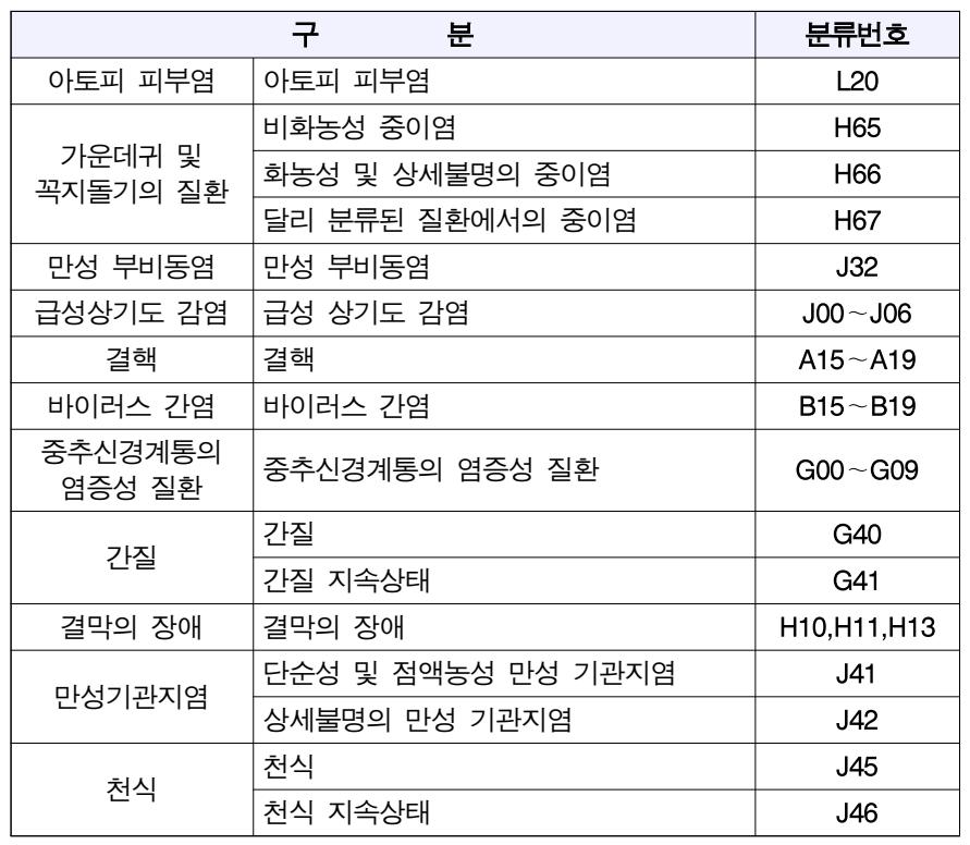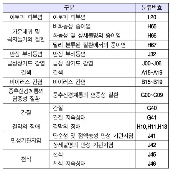 아토피 피부염 아토피 피부염 L20, 가운데귀 및 꼭지돌기의 질환 비화농성 중이염 H65