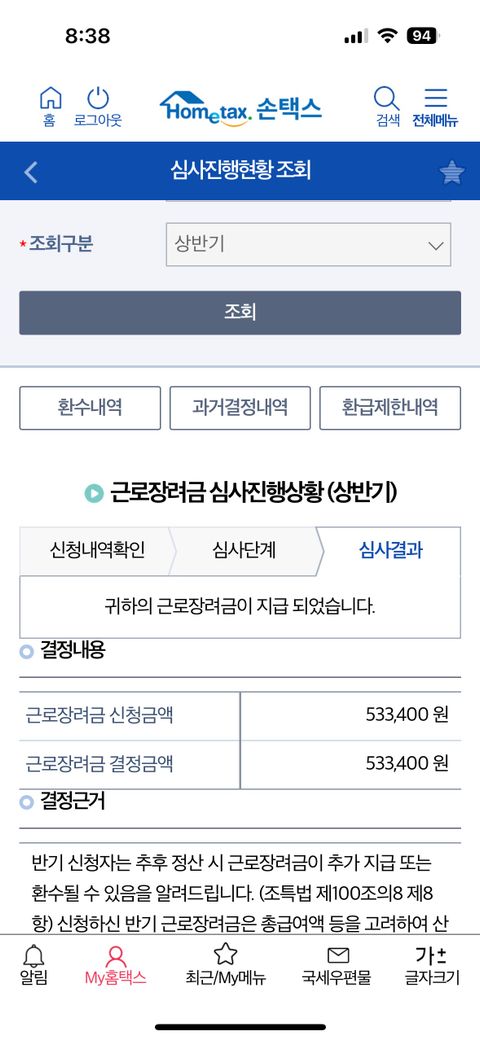 전에 근로장려금 상반기 신청했던 금액이