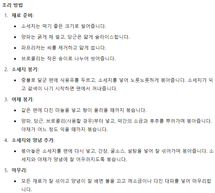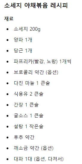 기본적인 레시피입니다. 소세지 야채볶음인데 아마 다른재료 넣고 해도 비슷할듯 합니다.