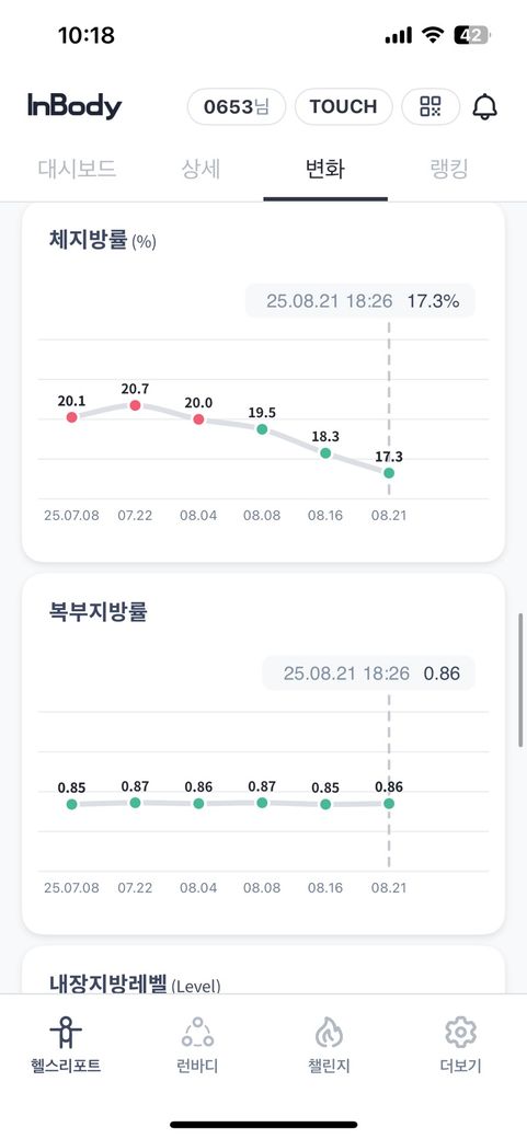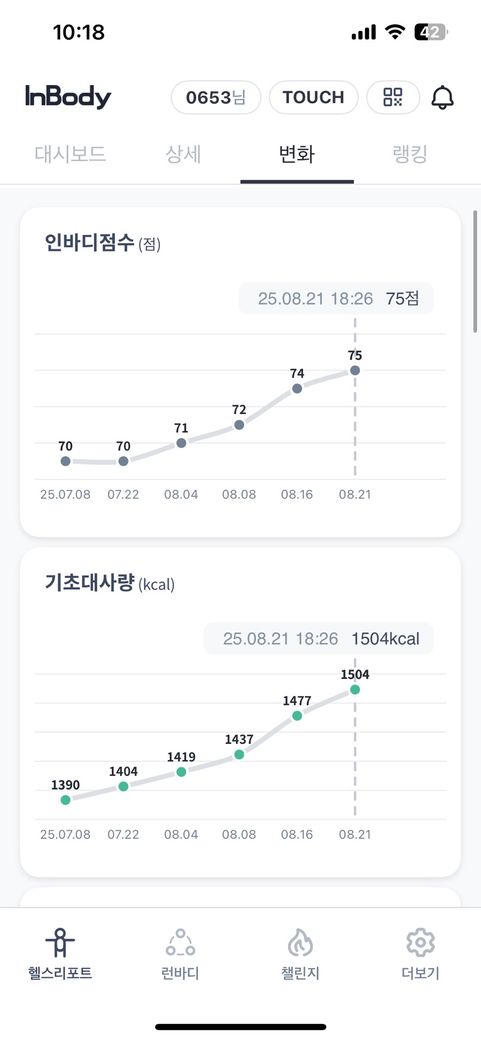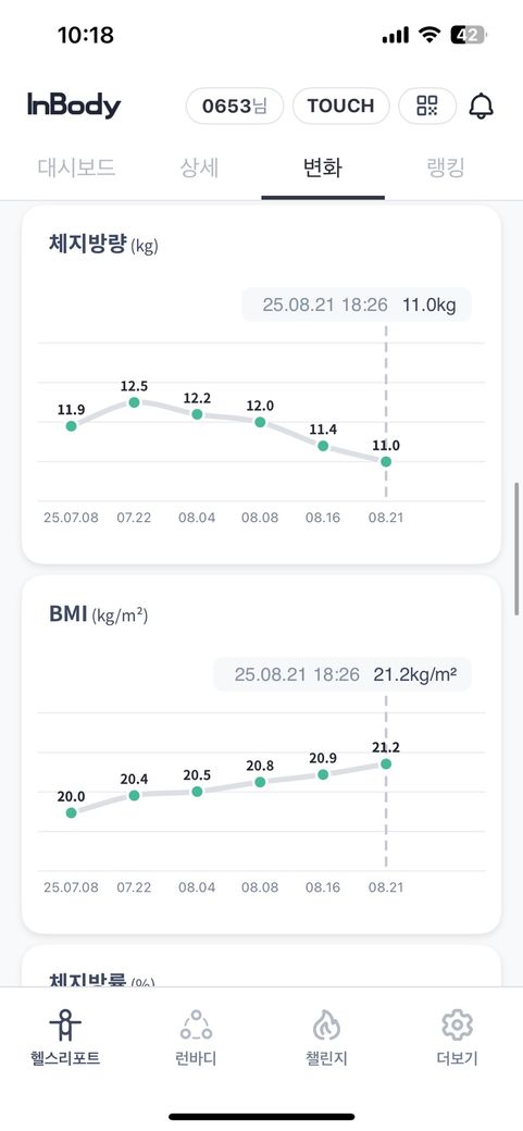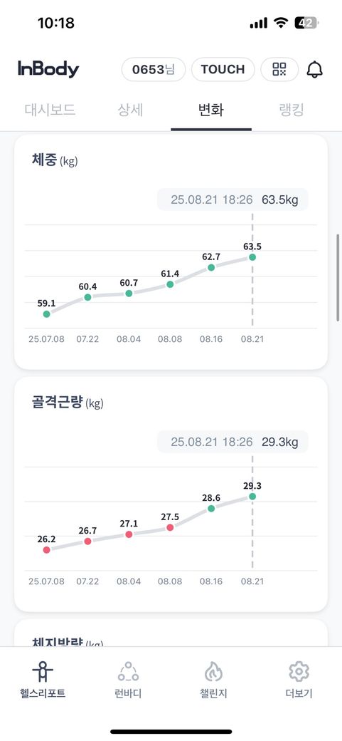 체중도 늘어나고 골격근량도 늘어나고 체지방은 줄어드는 아주 이상적으로 올라가고 있는데 현재 운동이나 식단에 큰 흠이 없어보입니다. 지금처럼 하시면서 운동을 점진적으로 늘리면서 하시면 될 거 같습니다.