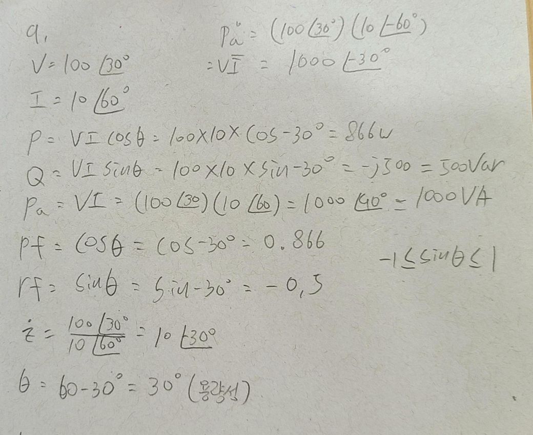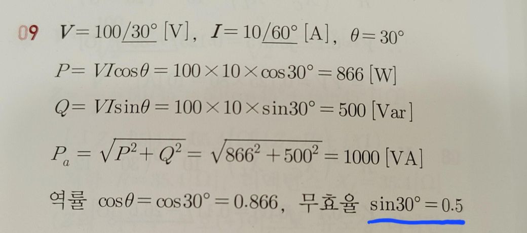 1. 문제에서 임피던스 각 θ=-30°가 나왔고 역률은 임피던스 각 θ에 cos를 해주면 되는 것으로 아는데 무효율은 왜 용량성인데 -0.5가 아니고 풀이의 답이 +0.5인가요? 무효율 범위는 -1≤sinθ≤1인데 이해가 안가네요.