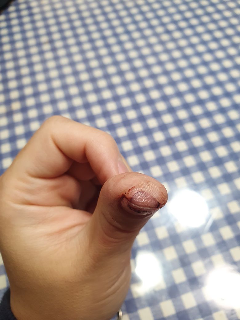 요리하다가 식칼에 손 끝이 반달모양으로 도려내듯 손톱과 함께 베였습니다. 완전 떨어진게 아니라 상처부위 왼쪽에서 오른쪽으로 80% 정도 칼이 들어갔네요.