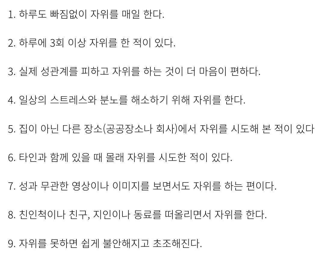첨부한 것은 정신의학 신문에 박종석 전문의가 올린 자위중독 자가 테스트입니다. 3가지 이상 해당 되면 한 번 상담을 받아보시기 바랍니다.