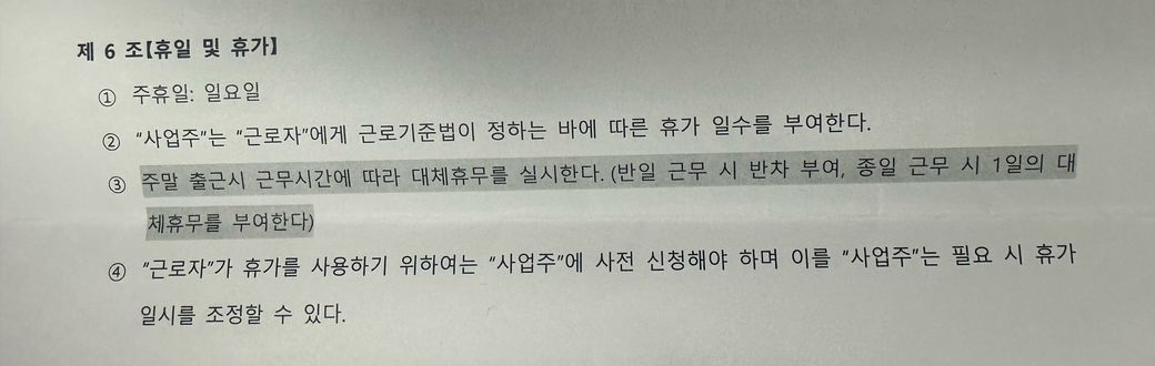 3.주말출근 시 근무시간에 따라 대체휴무를 실시한다.