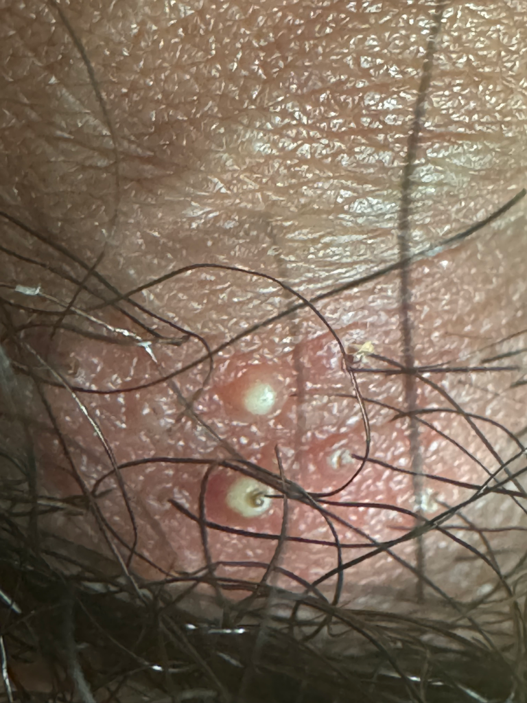 화농성 변화를 동반한 모낭염이라 보입니다. 피부과나 비뇨의학과를 방문해 진료받아보시면 되겠습니다.