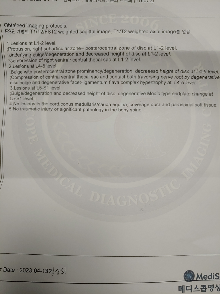 그런데 판독 결과들을 보면 모두 degenerative (퇴행)성 병변으로 적혀있어 교통사고때문에 생긴건지는 명확하지 않습니다.